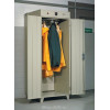Heute Mistral 18 – данный двухдверный сушильный шкаф был создан специально для рабочей спецодежды, плохо поддающейся сушке. Шкаф закрывается на цилиндрический замок. Вращающаяся круглая вешалка, смонтированная на потолочной панели шкафа, облегчает подвешивание и снятие одежды. Вентилятор с нагревом подогревает всасываемый воздух и подает его внутрь шкафа. При этом круглая вешалка медленно вращается в шкафу, обеспечивая щадящую сушку развешанной на ней мокрой одежды любого типа. Встроенный 24-часовой таймер позволяет устанавливать продолжительность сушки (от 1-го до 3-х час в зависимости от типа одежды и степени ее влажности), а также время сушки (например, с 20:00 час до 22:00 час). Вода, стекающая с одежды, а также конденсат, образующийся при сушке, отводятся из шкафа через маленькое сточное отверстие в полу шкафа.Возможные варианты поставки: